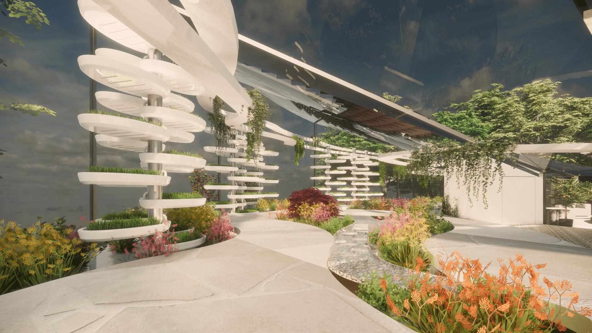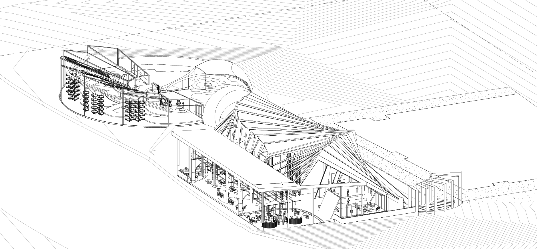 The main design goal was to maximize natural light, ventilation, and energy efficiency. The restaurant’s dramatic form frames scenic views while flooding the interior with abundant natural light. The form of the greenhouse complements the restaurant, maximizing natural light.