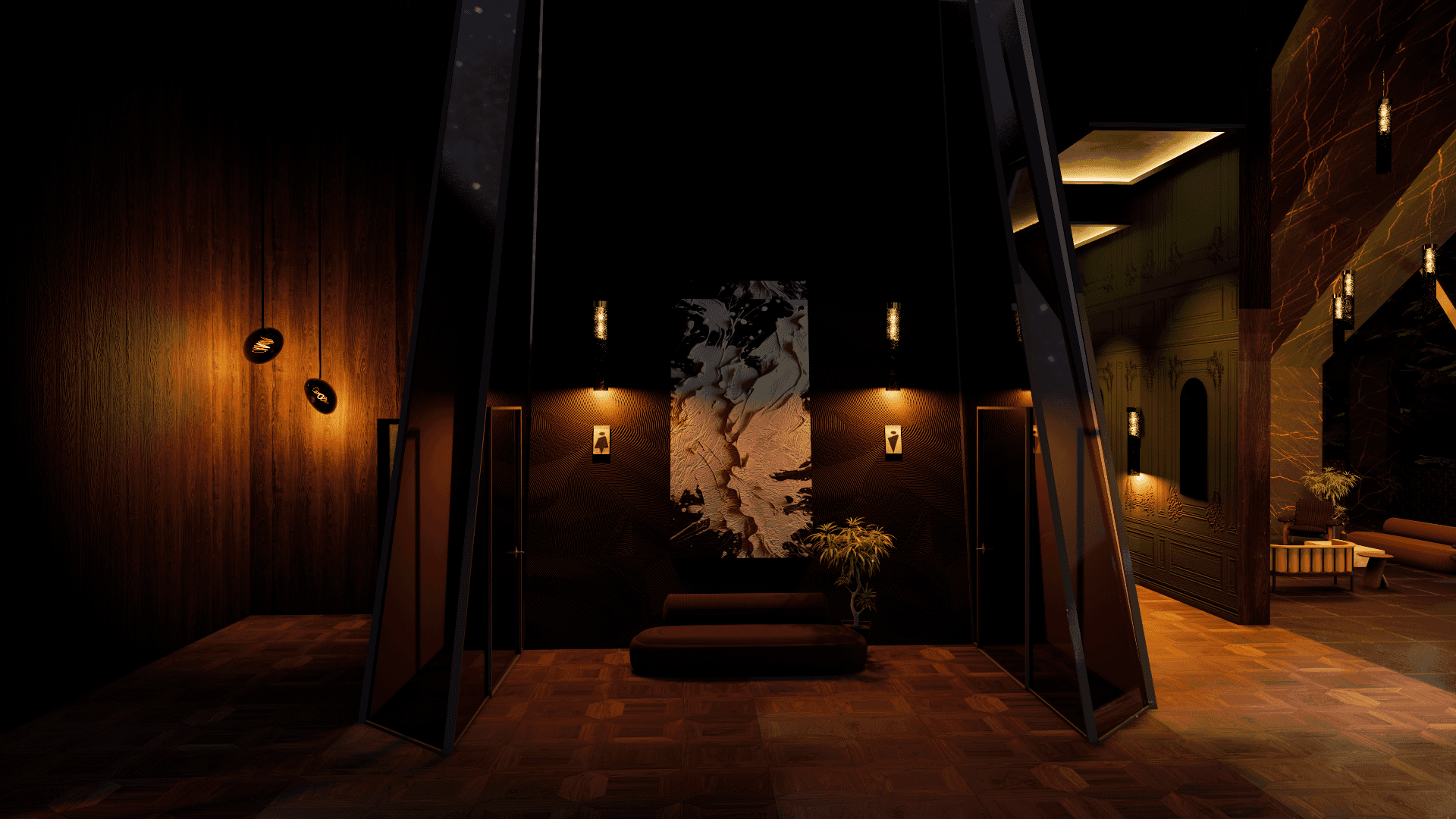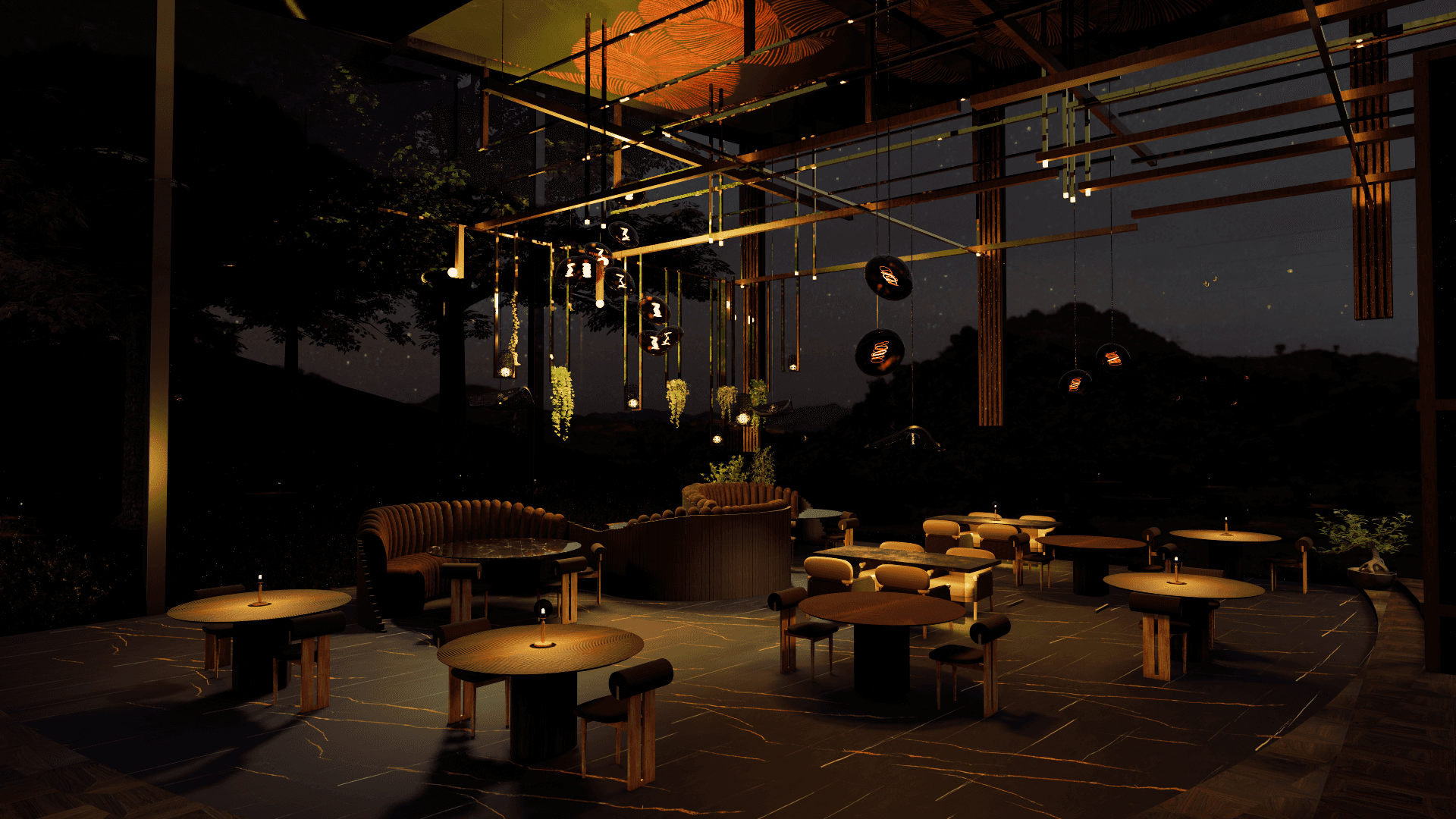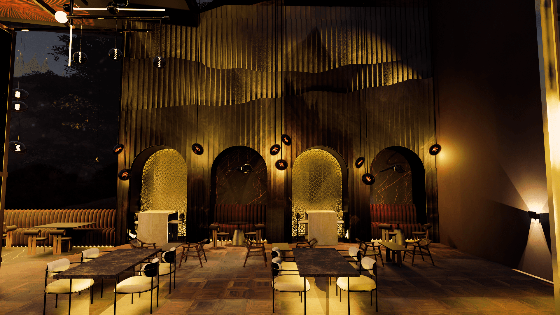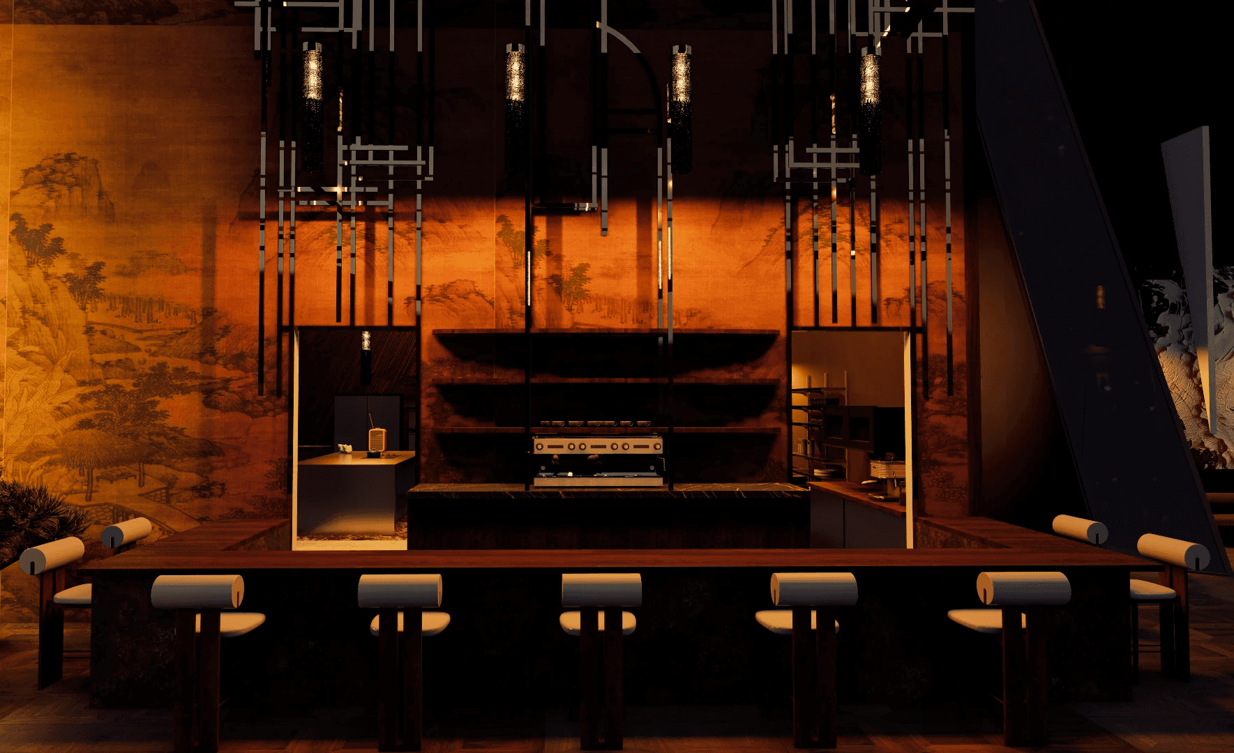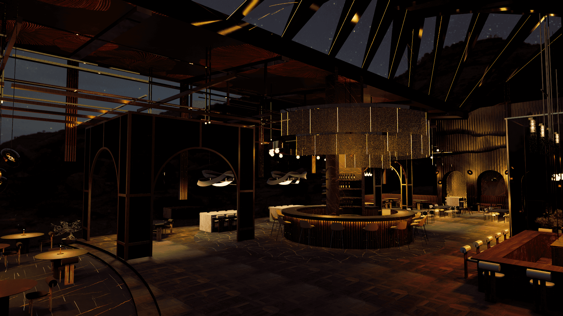 A modern luxury restaurant hidden in the most breathtaking Swiss Alps. Using design to tell the story of the short film. A dramatic and beautiful environment for a tragic character.