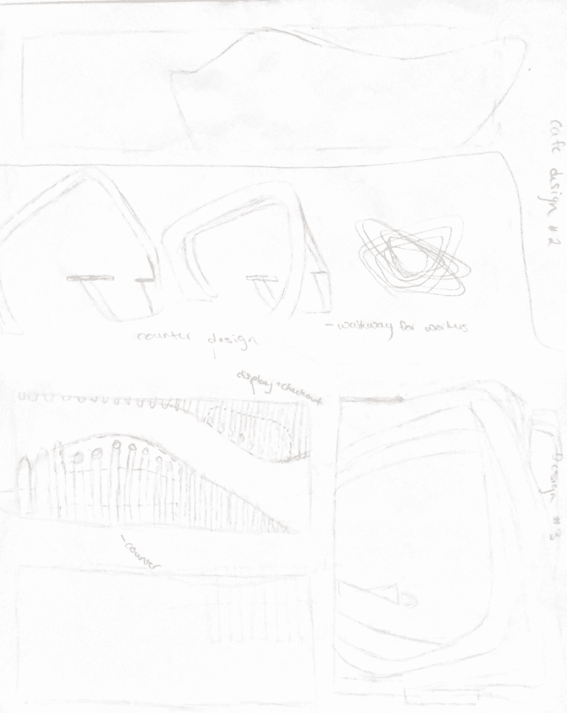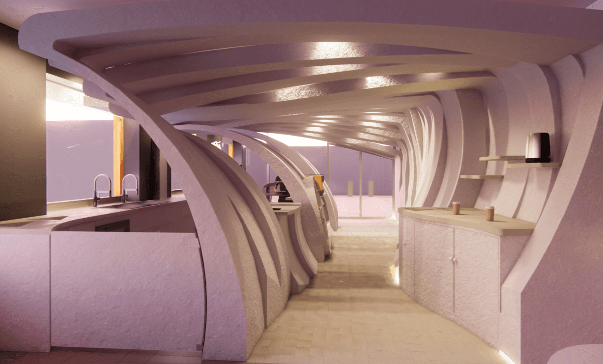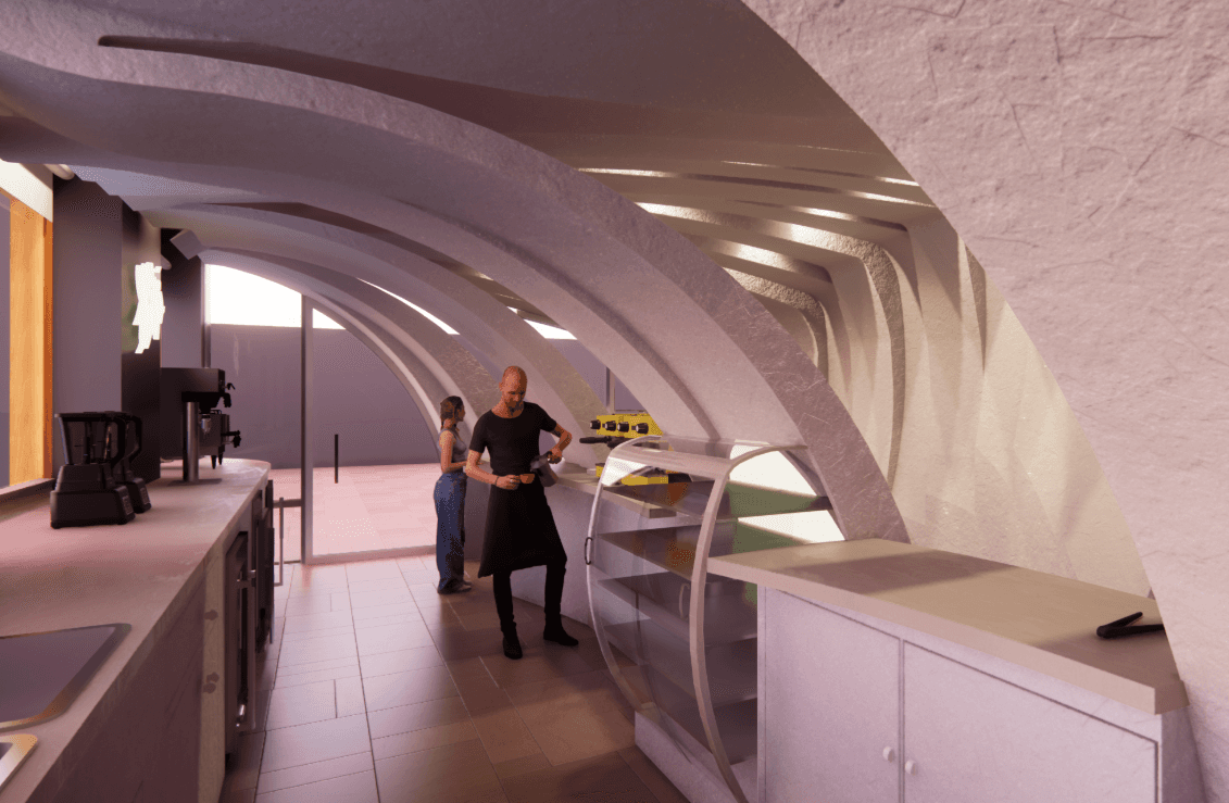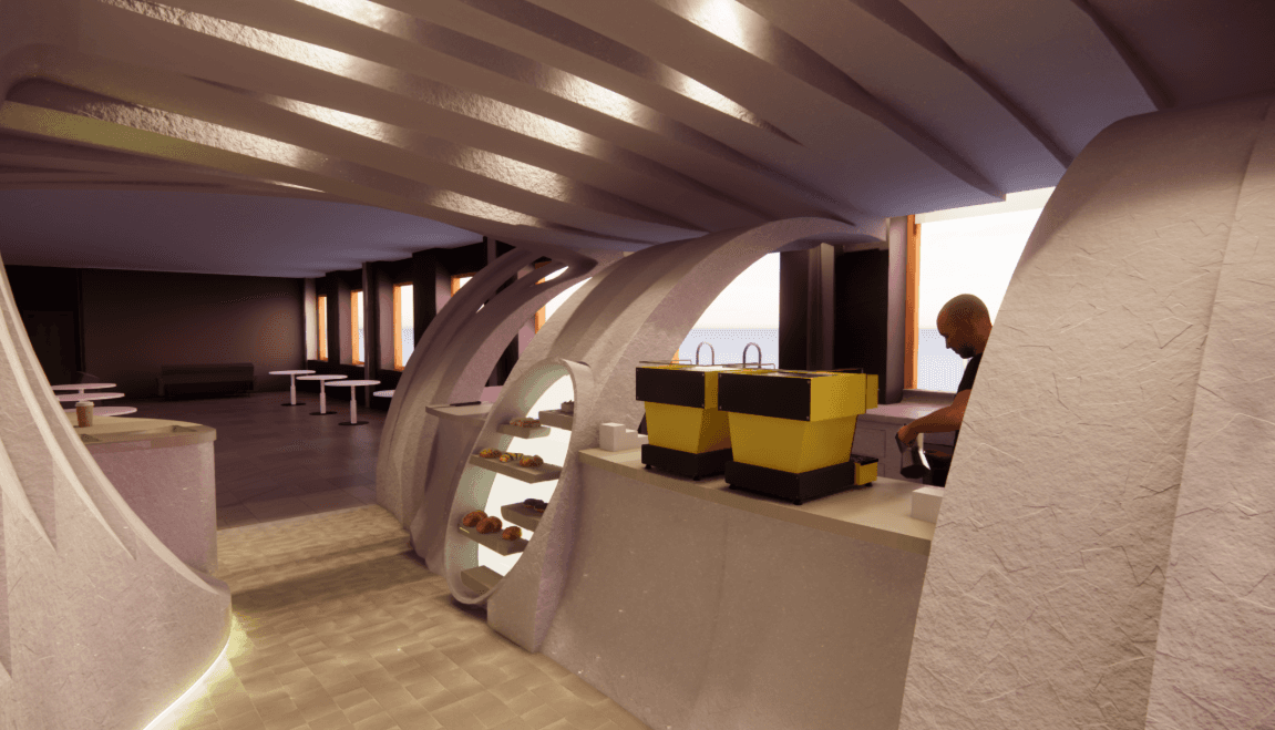 The main concept for this cafe is to have an inspiring location on campus for students. Using the Endless Flow Chair's design, the design concept was refined.